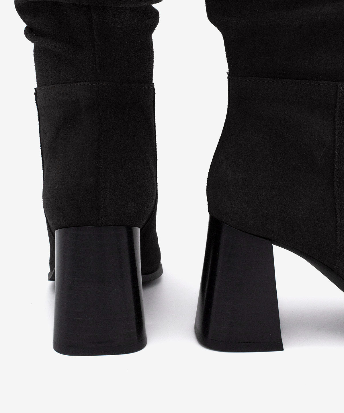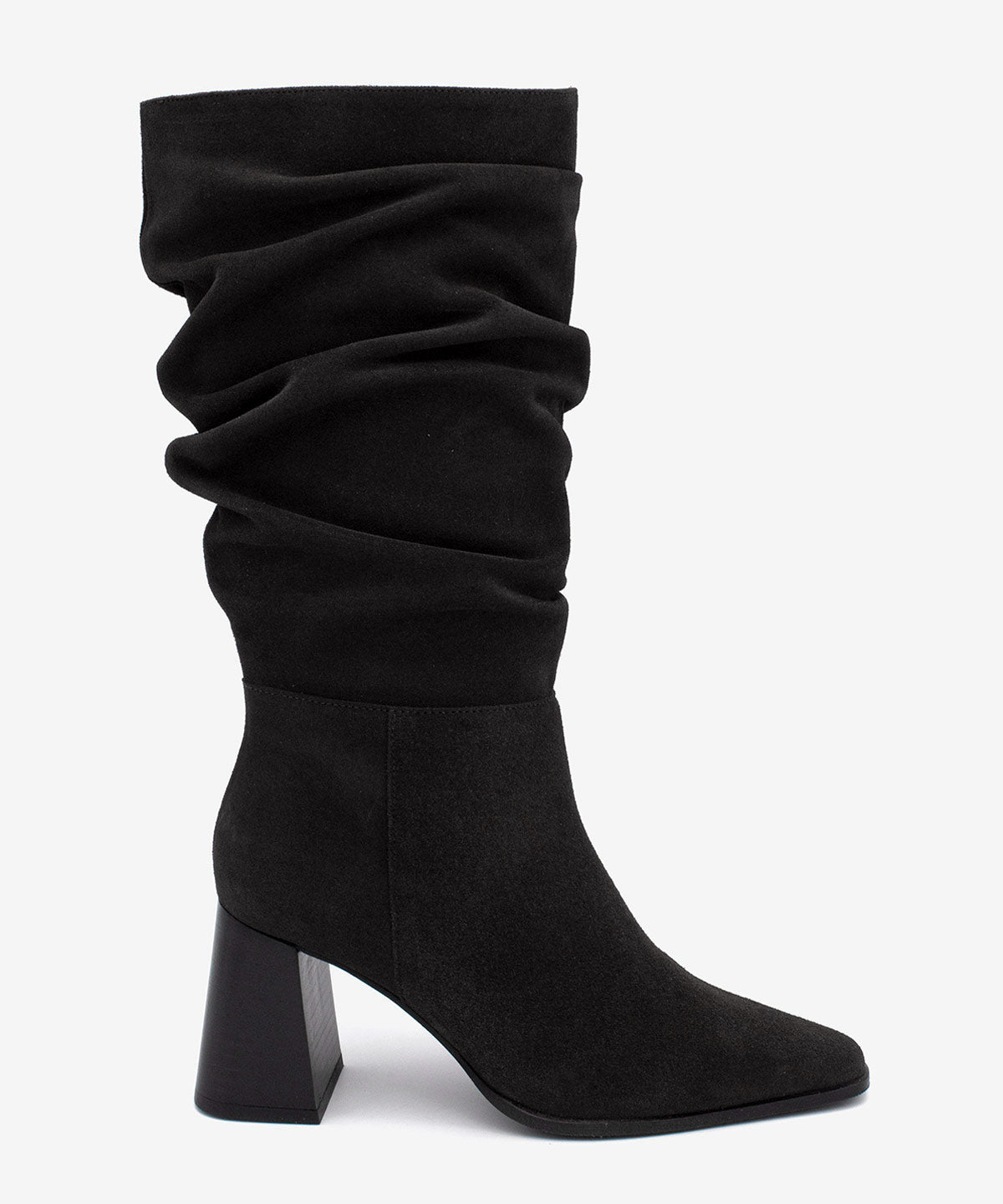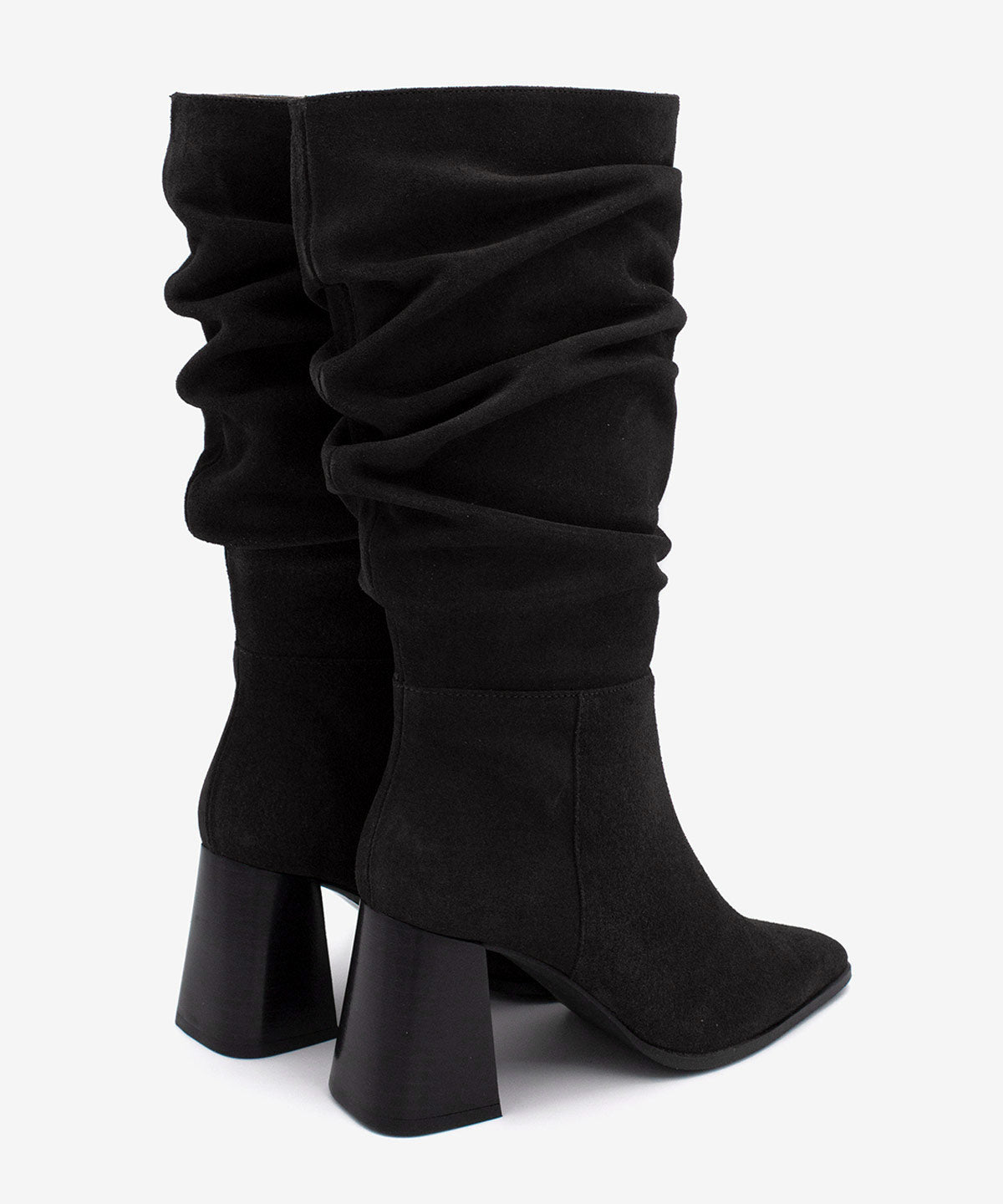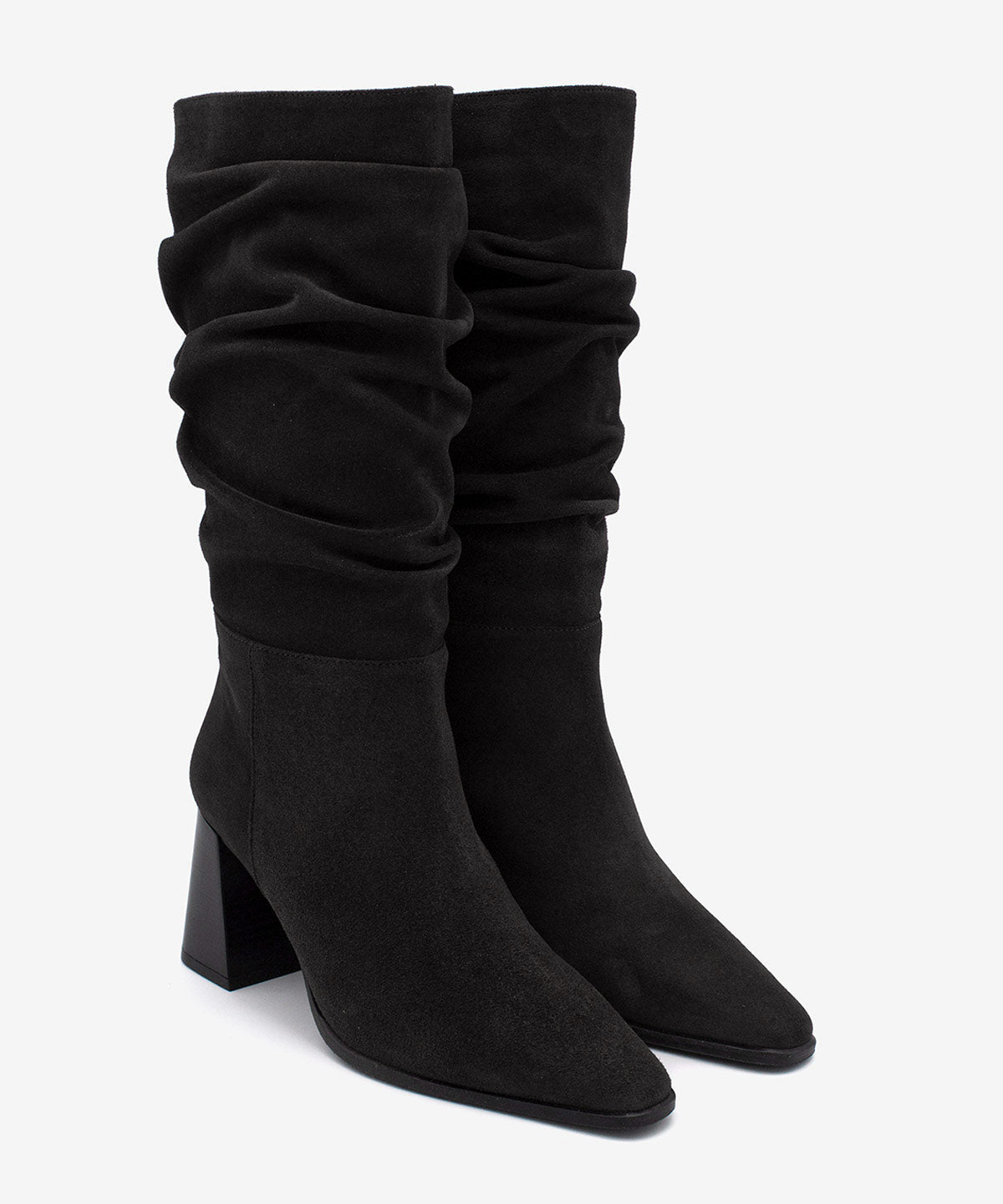 El modelo Tridal es una bota de mujer con caña ancha y efecto arrugado, punta fina y tacón ancho de 7 cm forrado en imitación madera. Con suela de goma que aporta agarre y comodidad, es un diseño elegante y versátil para looks diarios o de vestir.