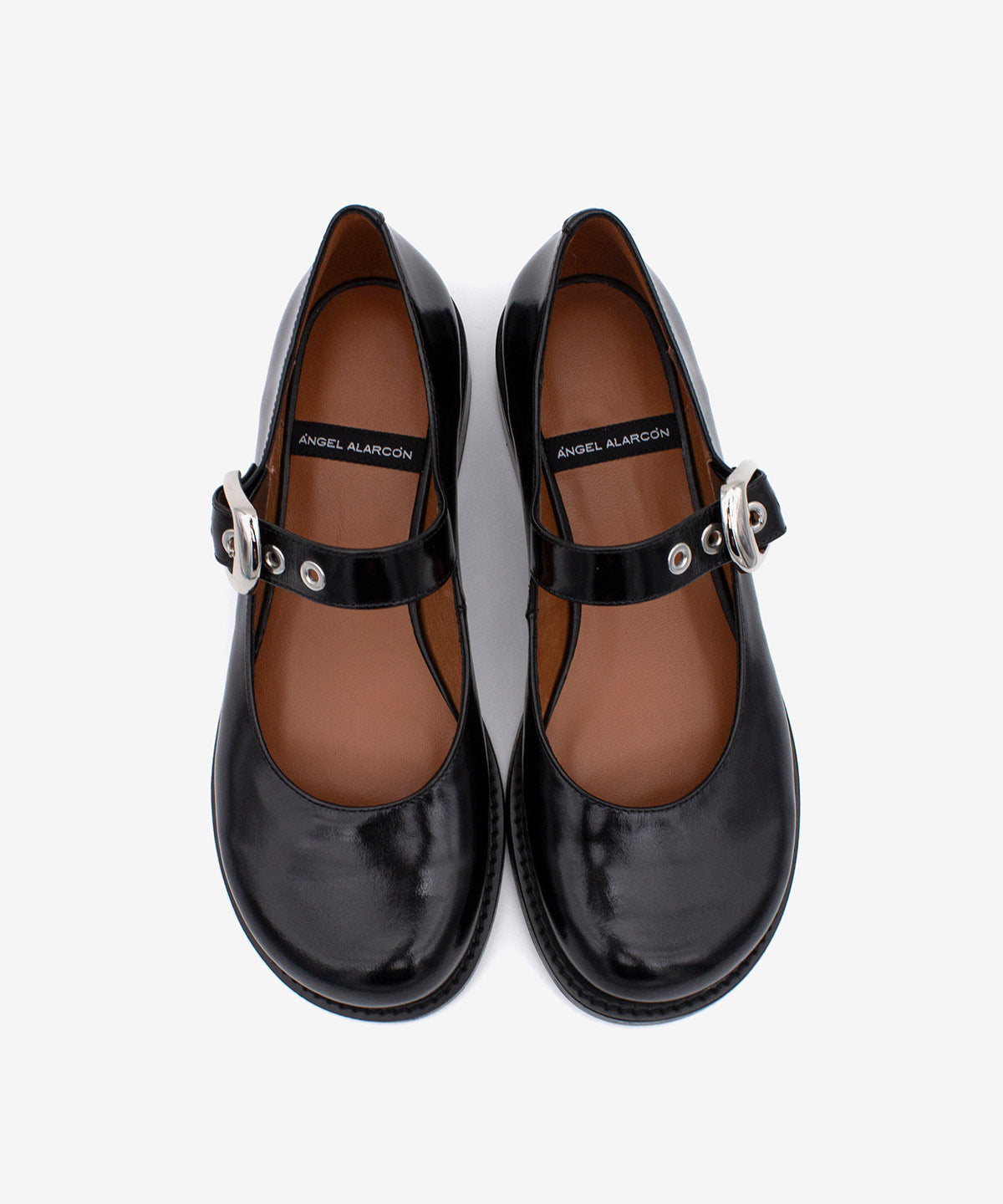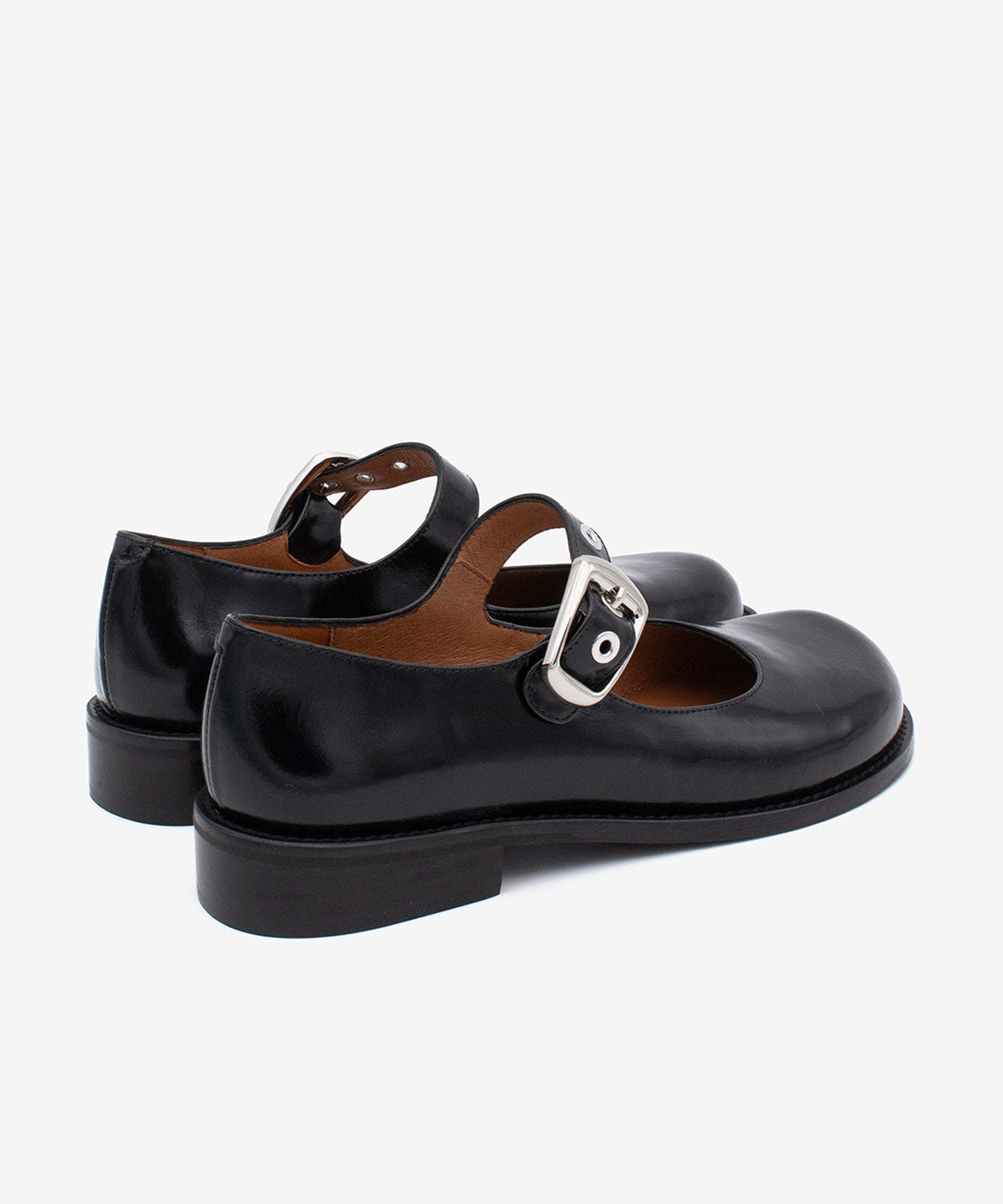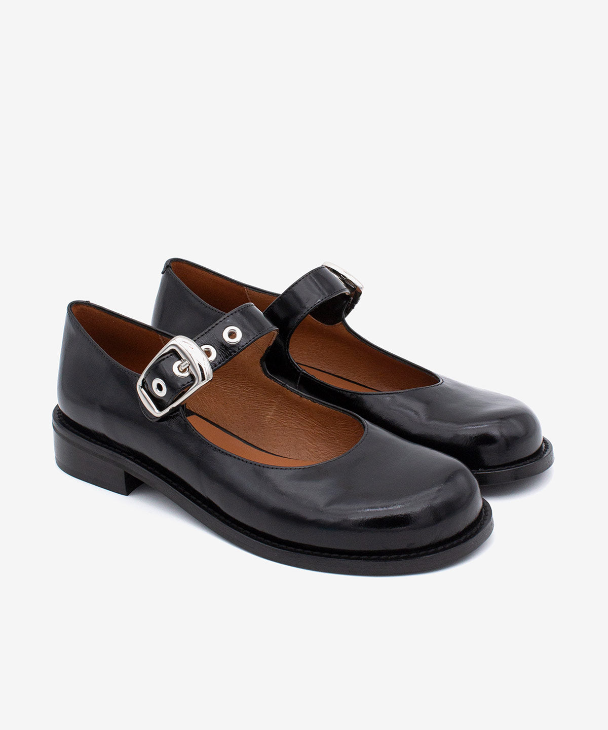 El modelo VALERIE es un zapato tipo merceditas con suela de goma y tacón de 2 cm. Presenta punta redonda y una hebilla grande que le aporta un estilo moderno y atrevido, manteniendo la comodidad en cada paso.