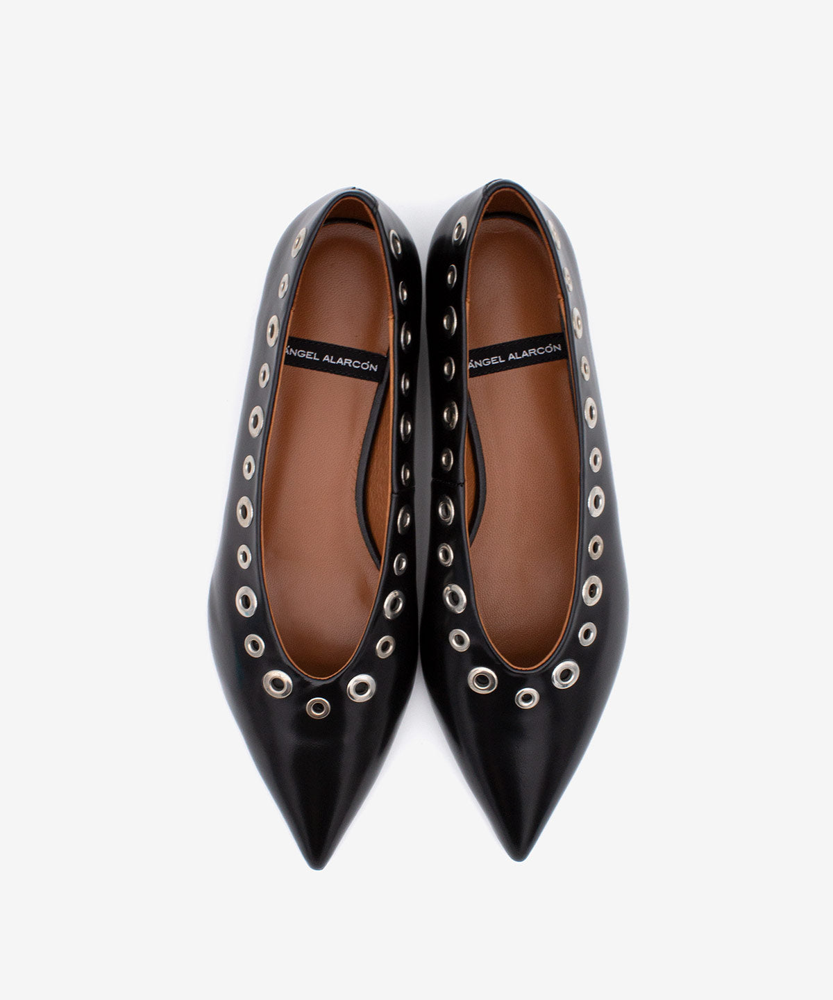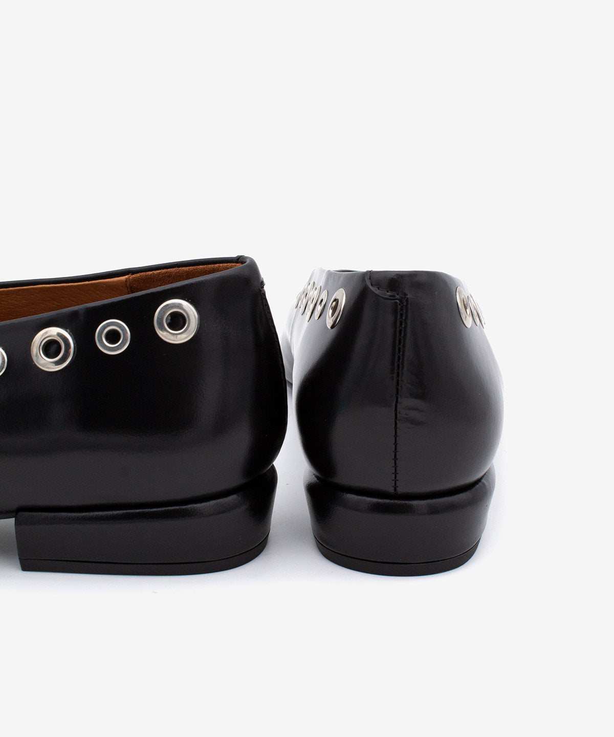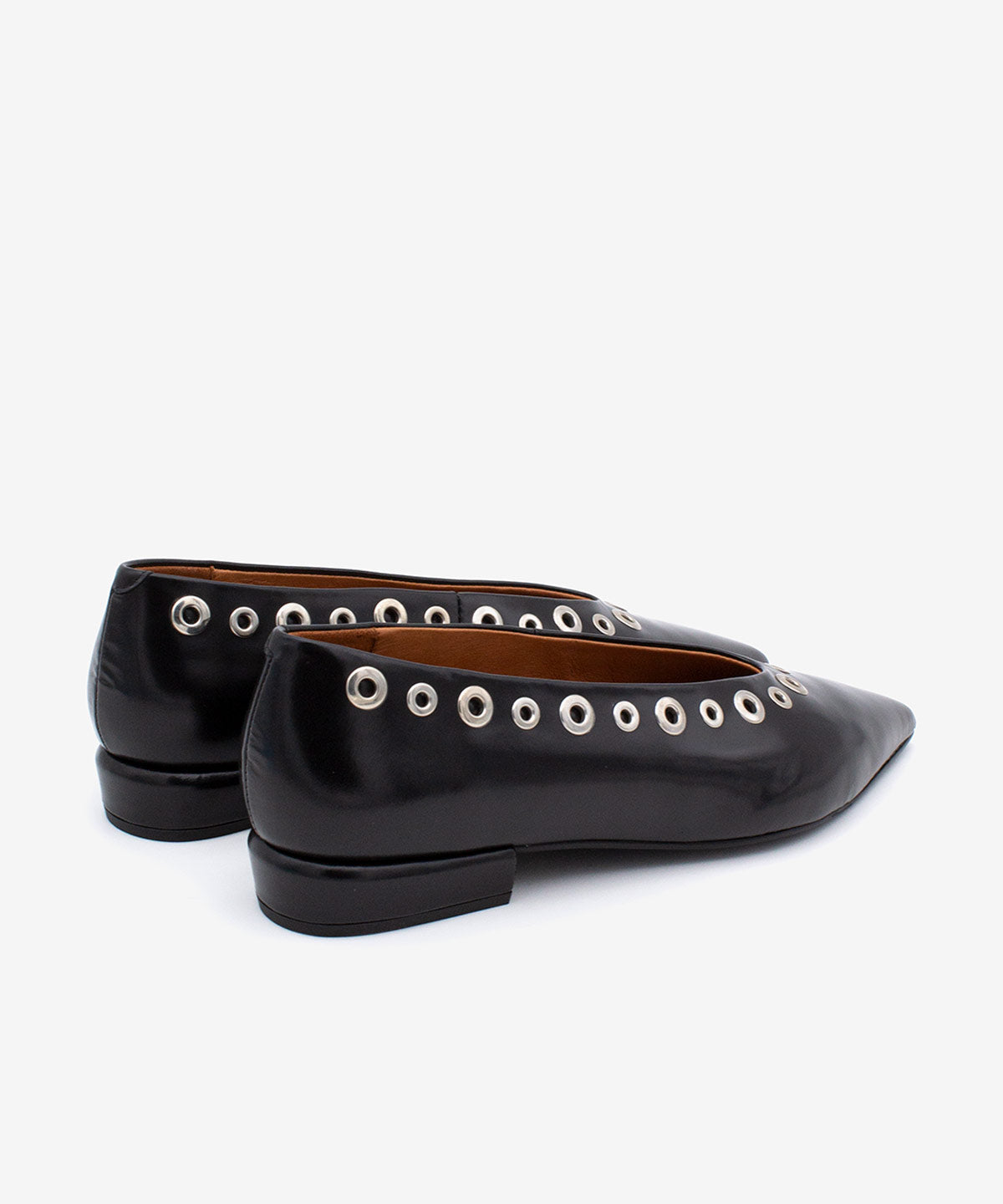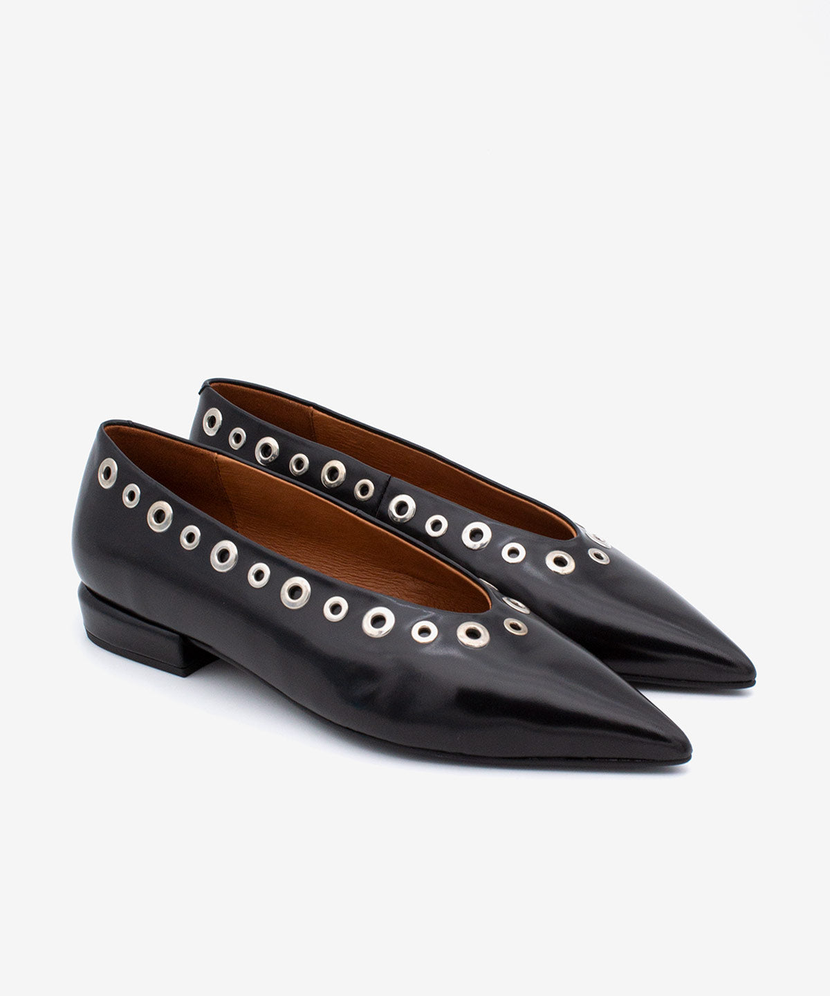 Bailarina con adorno de tachas punta fina y tacón bajo ancho de Piel acharolada