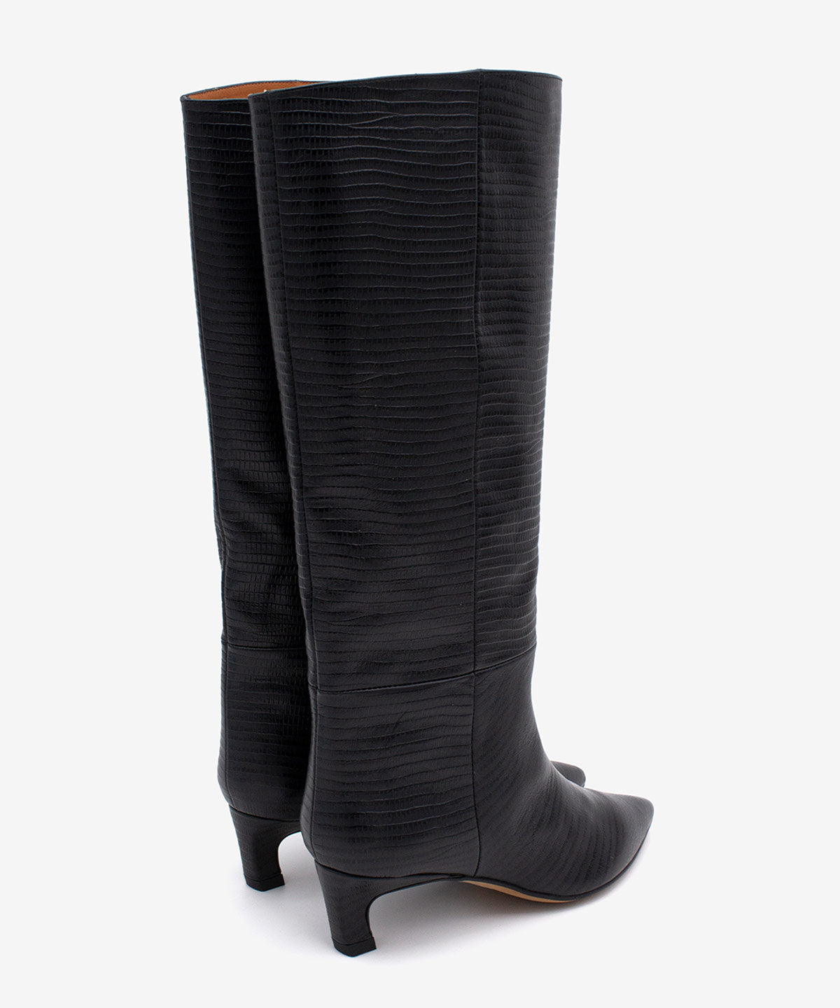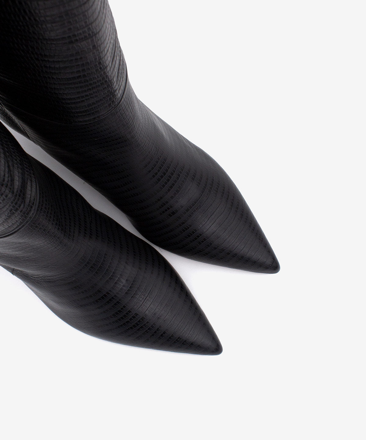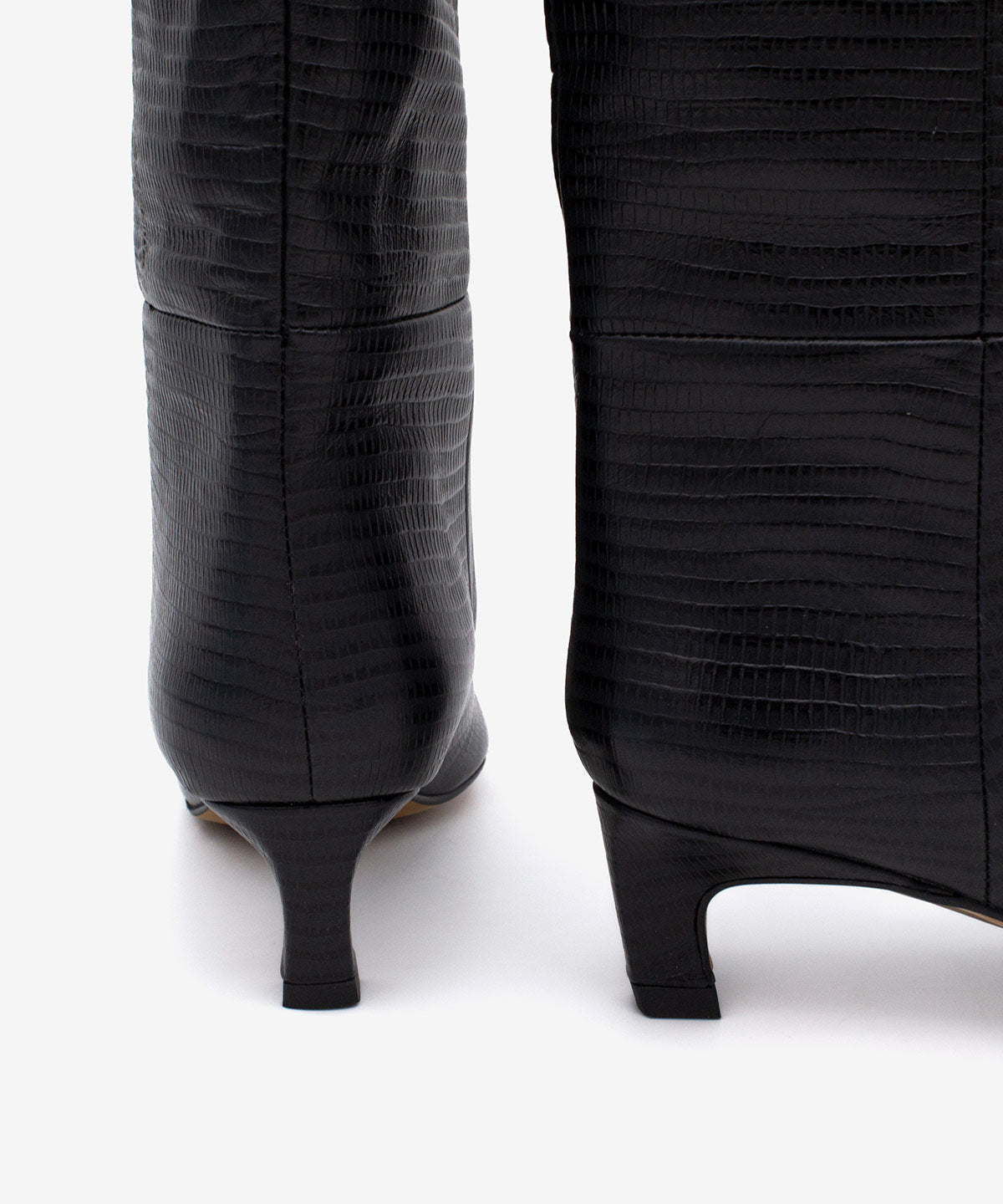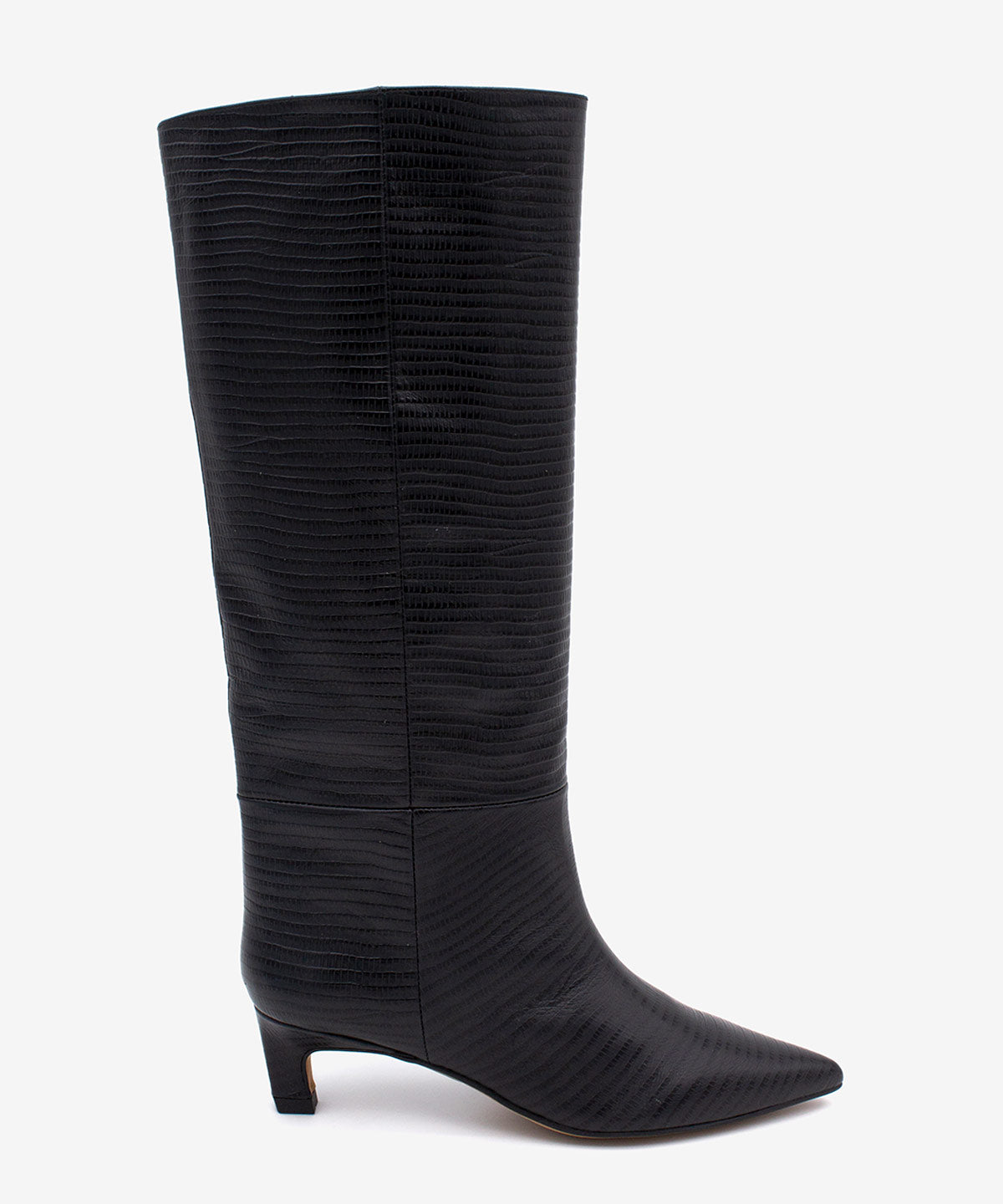 Botín de mujer de caña ancha con tacón bajo y punta fina de Piel print lagart.