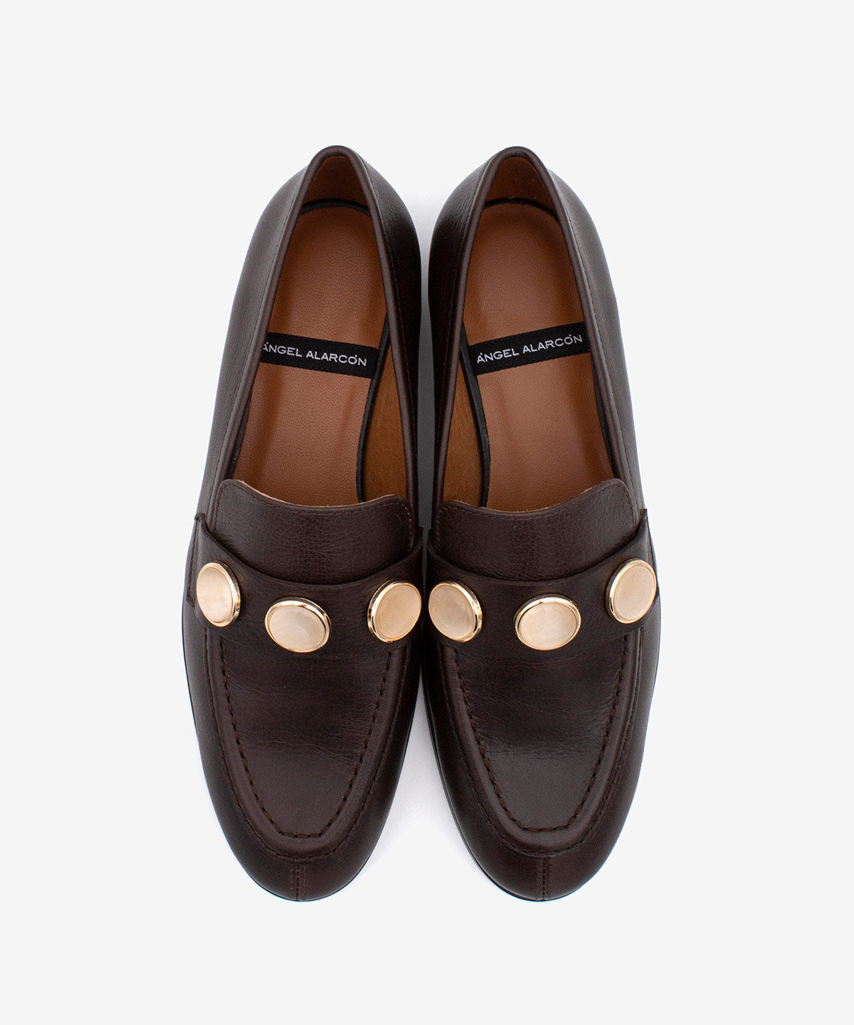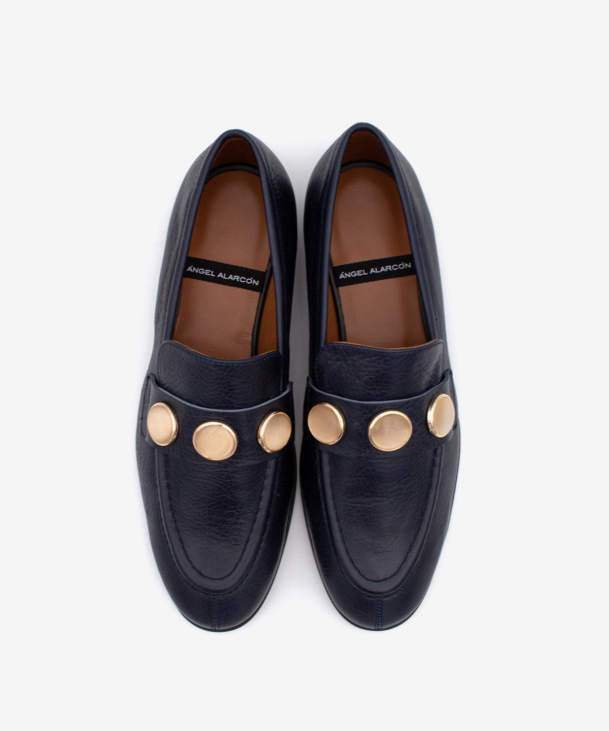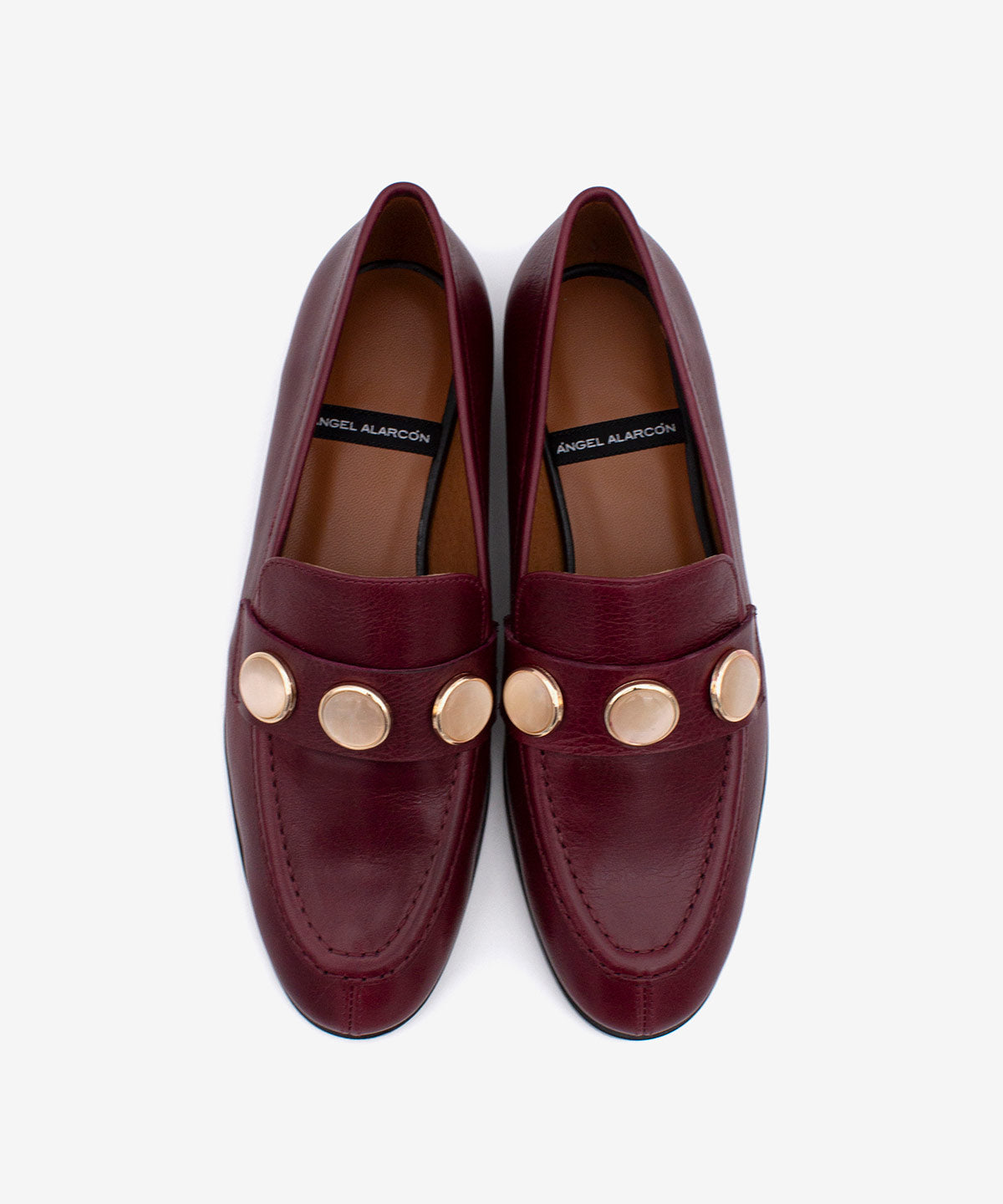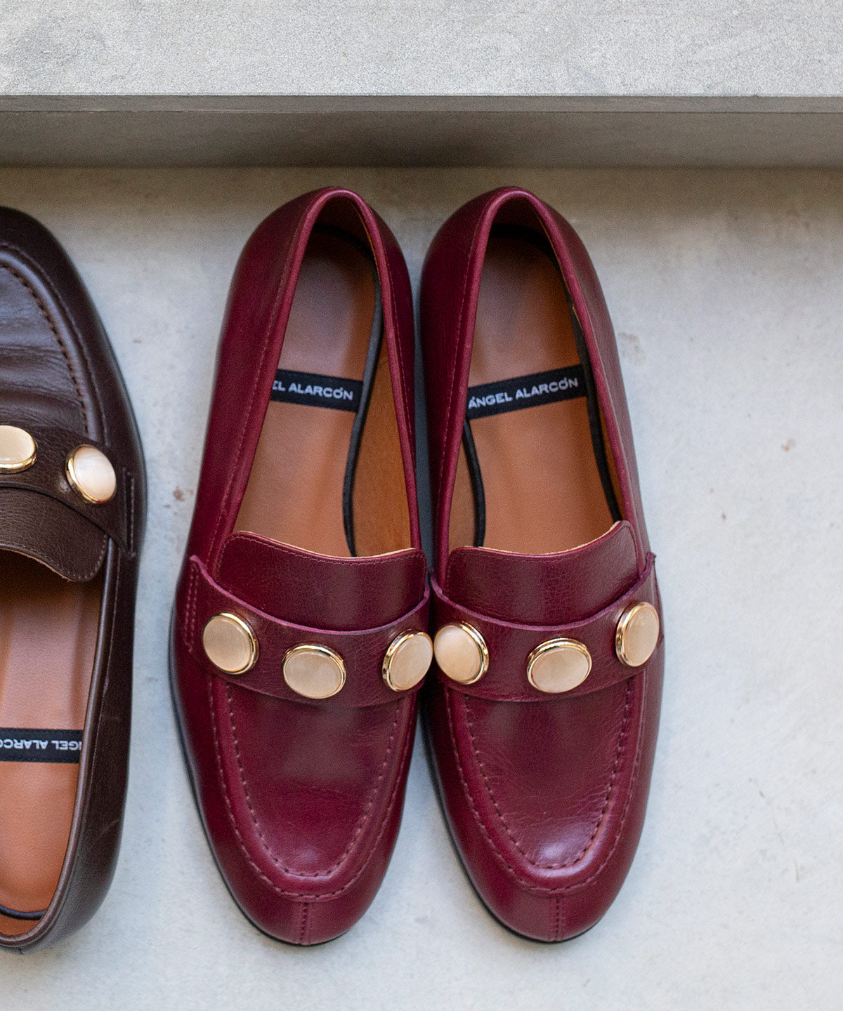 El modelo JUNA es un mocasín de mujer plano con tacón ancho de 2 cm y suela gruesa de goma TPU. Destaca por su elegante adorno de esferas metálicas, que aporta un toque moderno y sofisticado a un diseño cómodo y versátil para el día a día.