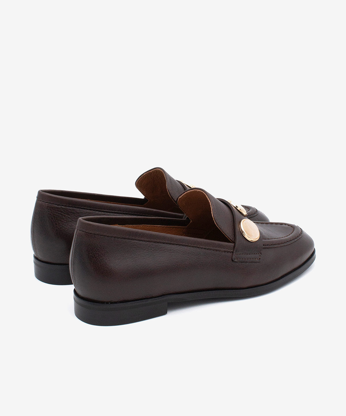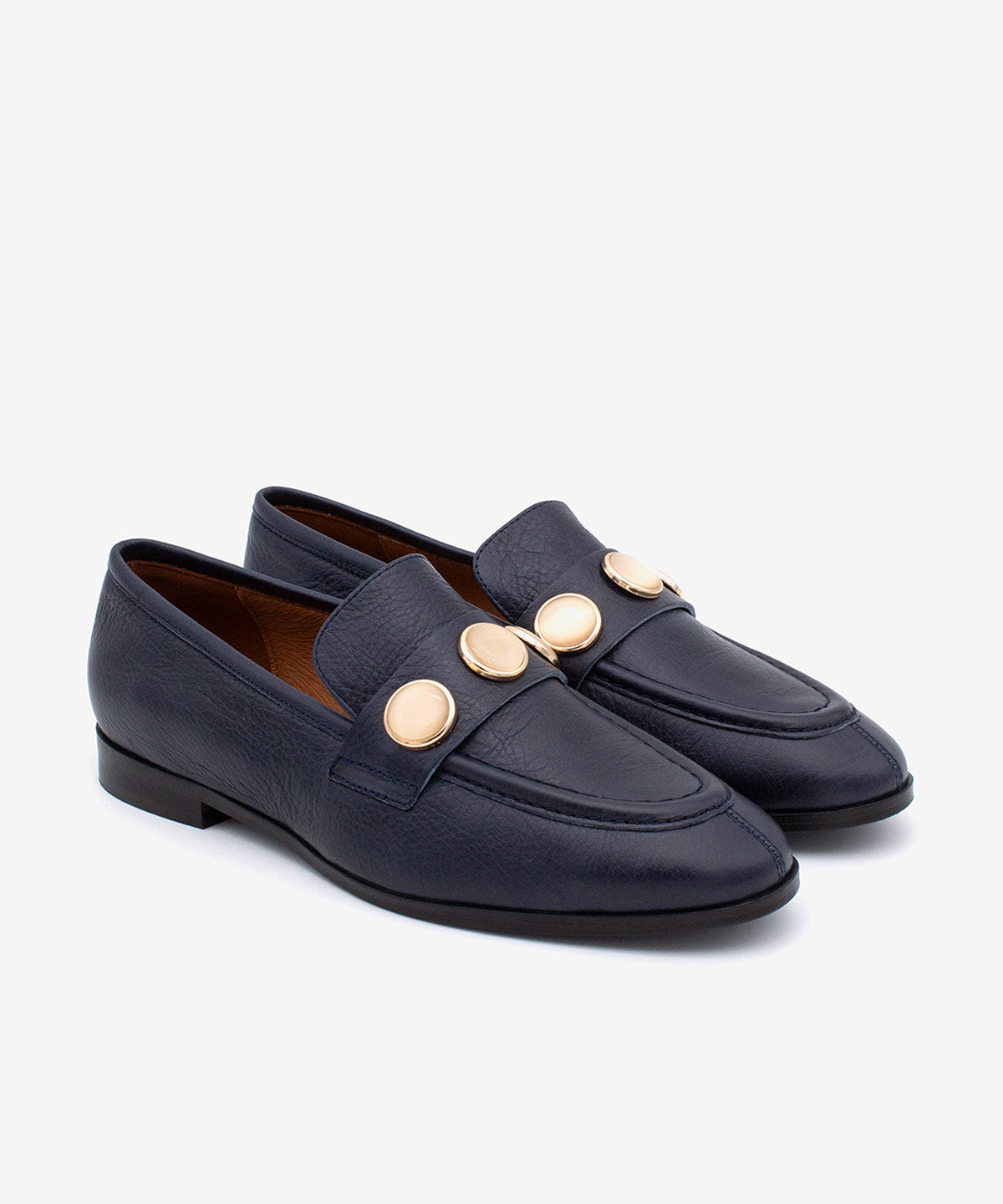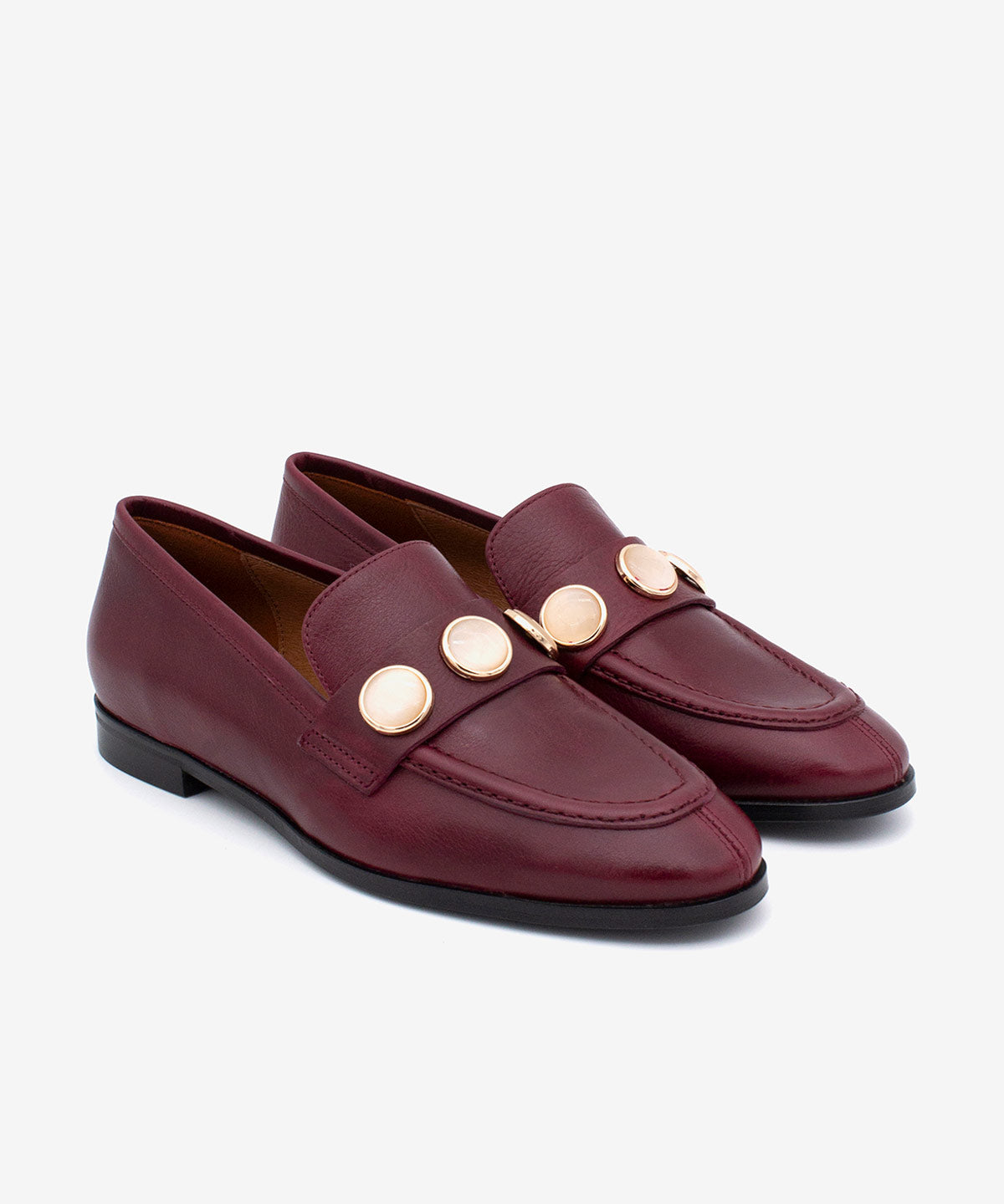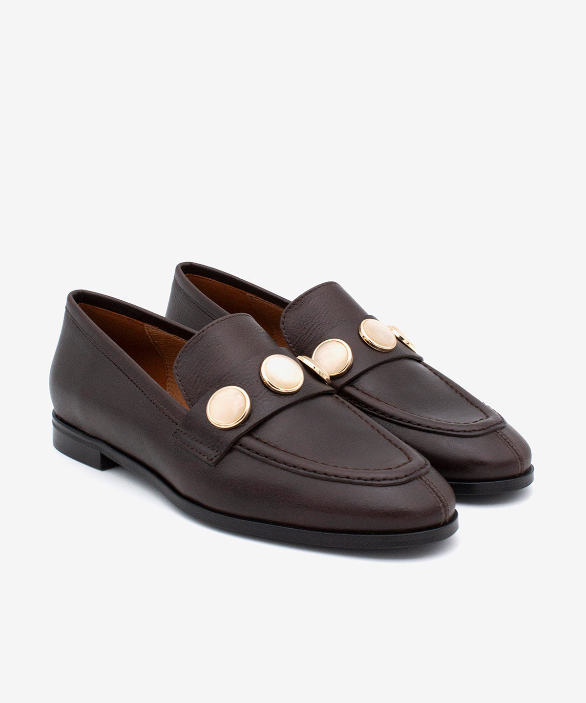 El modelo JUNA es un mocasín de mujer plano con tacón ancho de 2 cm y suela gruesa de goma TPU. Destaca por su elegante adorno de esferas metálicas, que aporta un toque moderno y sofisticado a un diseño cómodo y versátil para el día a día.