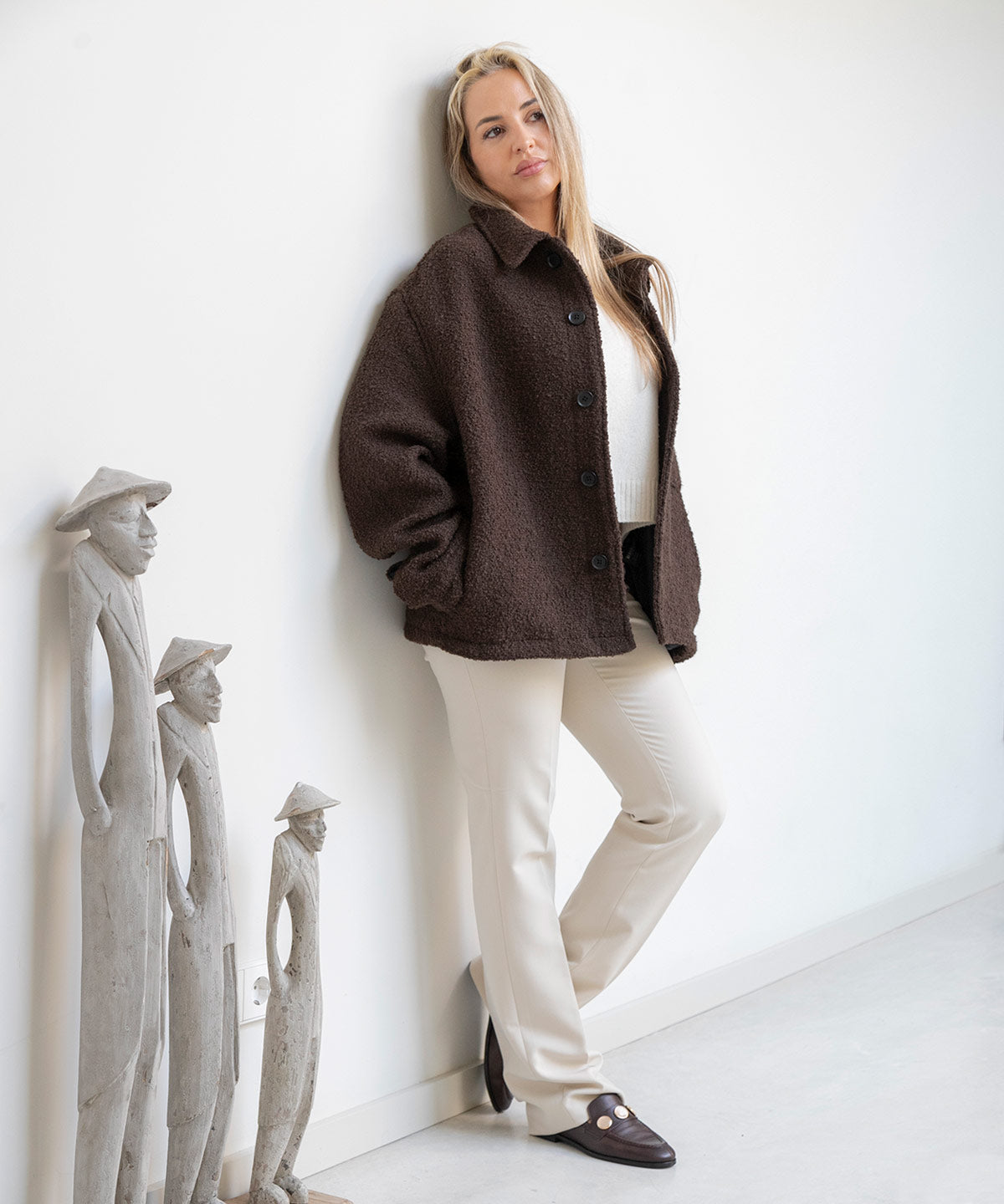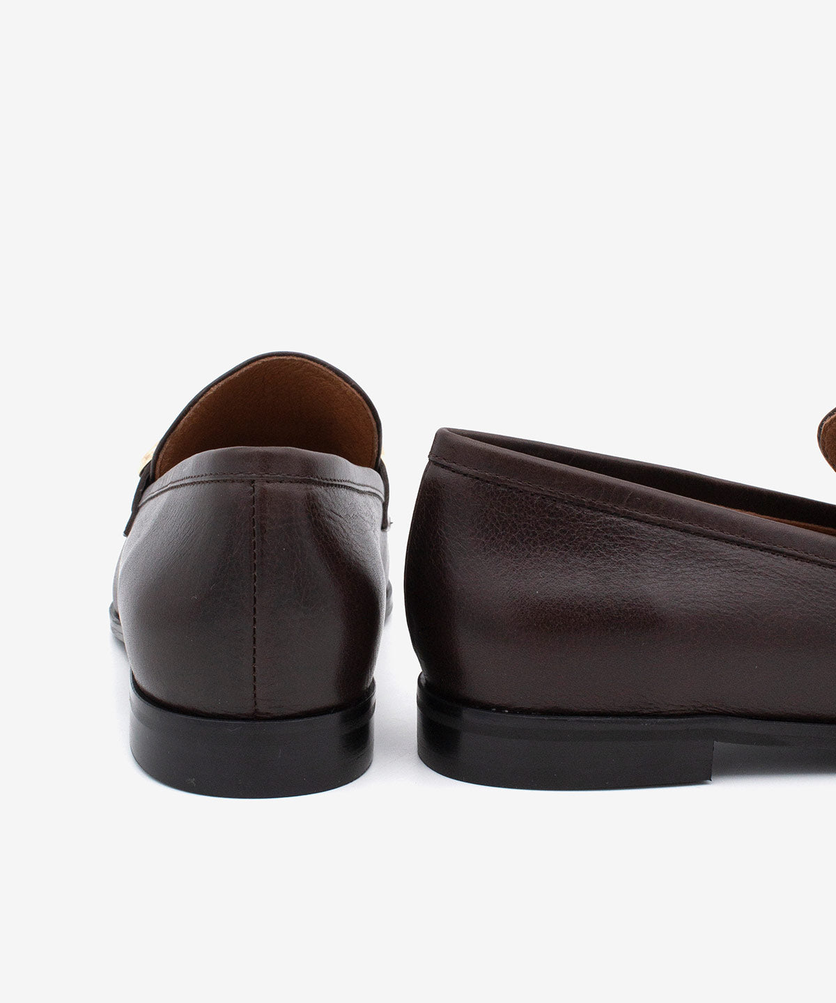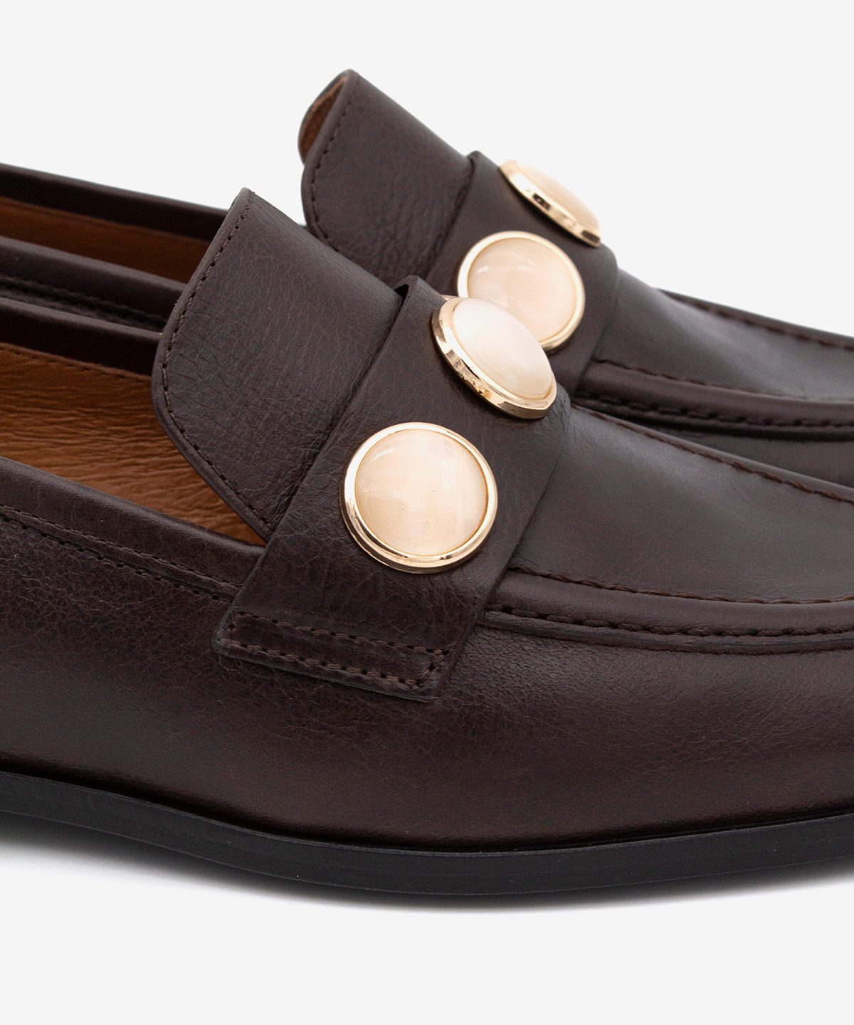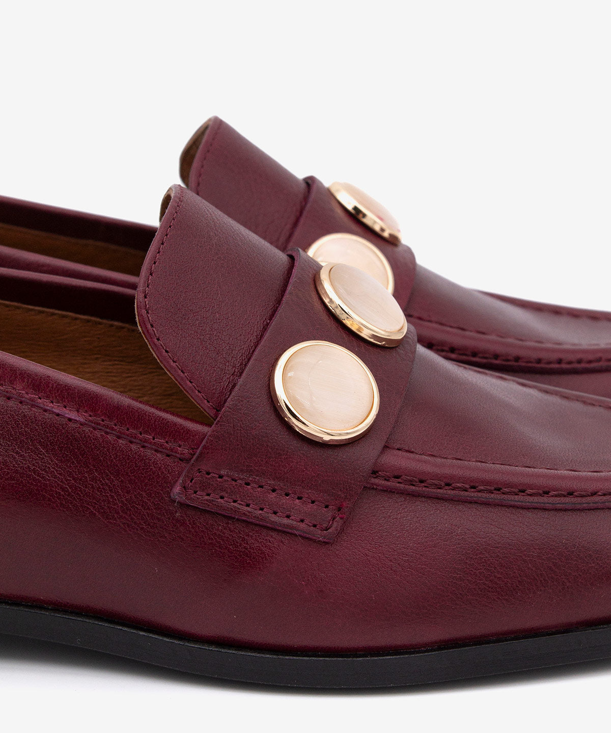 El modelo JUNA es un mocasín de mujer plano con tacón ancho de 2 cm y suela gruesa de goma TPU. Destaca por su elegante adorno de esferas metálicas, que aporta un toque moderno y sofisticado a un diseño cómodo y versátil para el día a día.