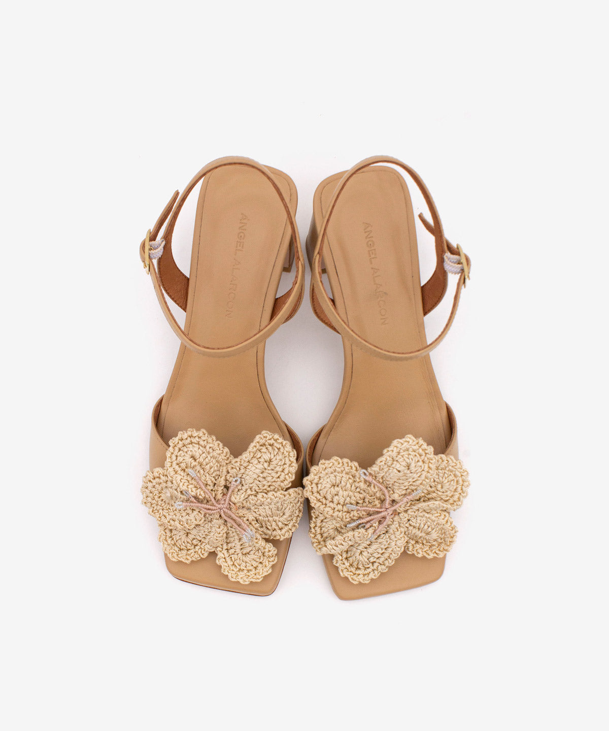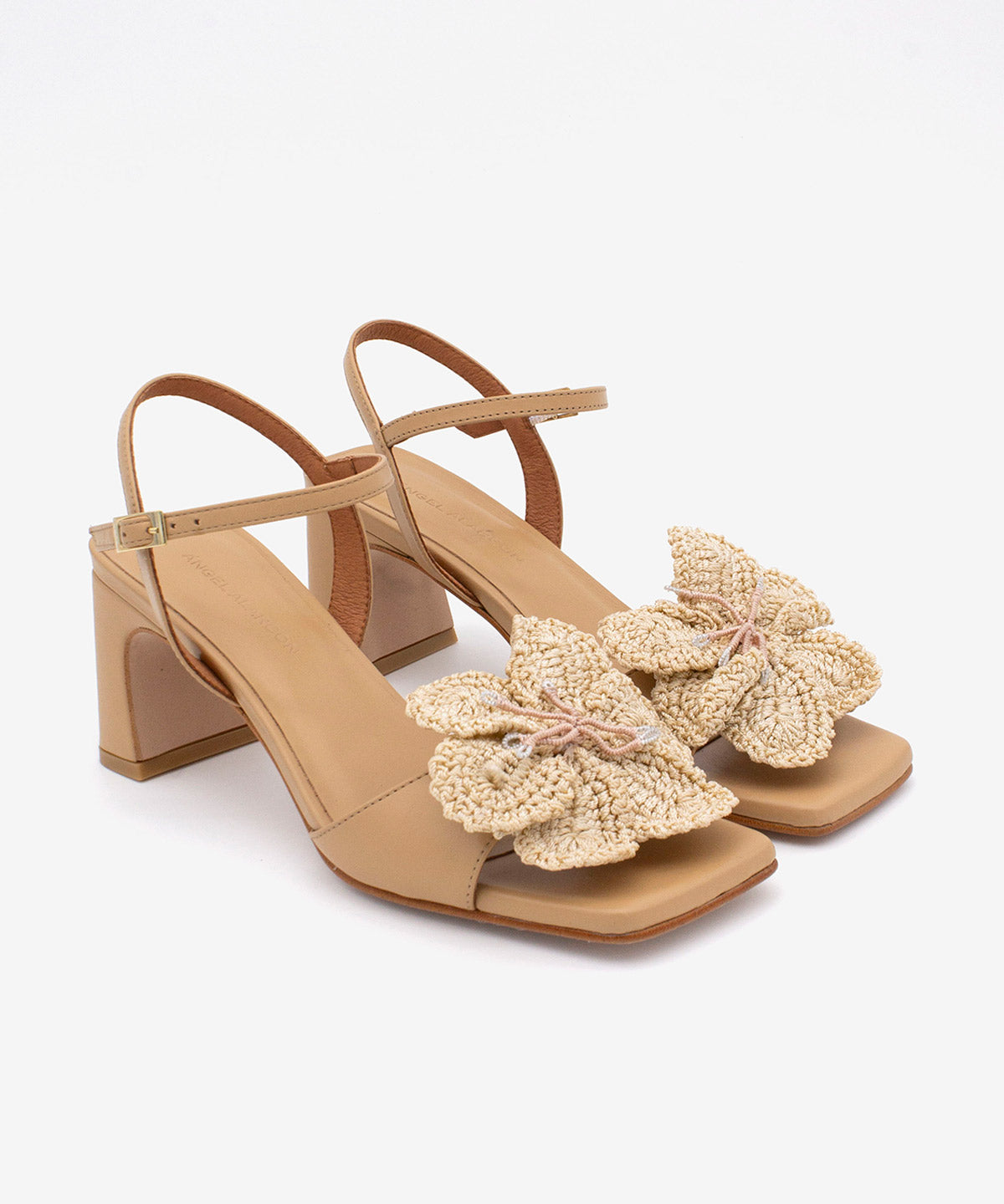 The vamp features a delicate floral crochet embellishment, adding an artisanal and feminine touch to the design. The strapped structure securely holds the foot, while the block heel provides a safe and balanced stride.
