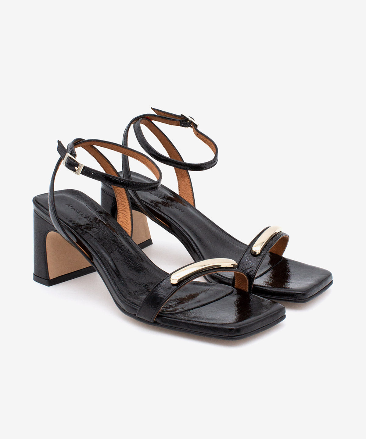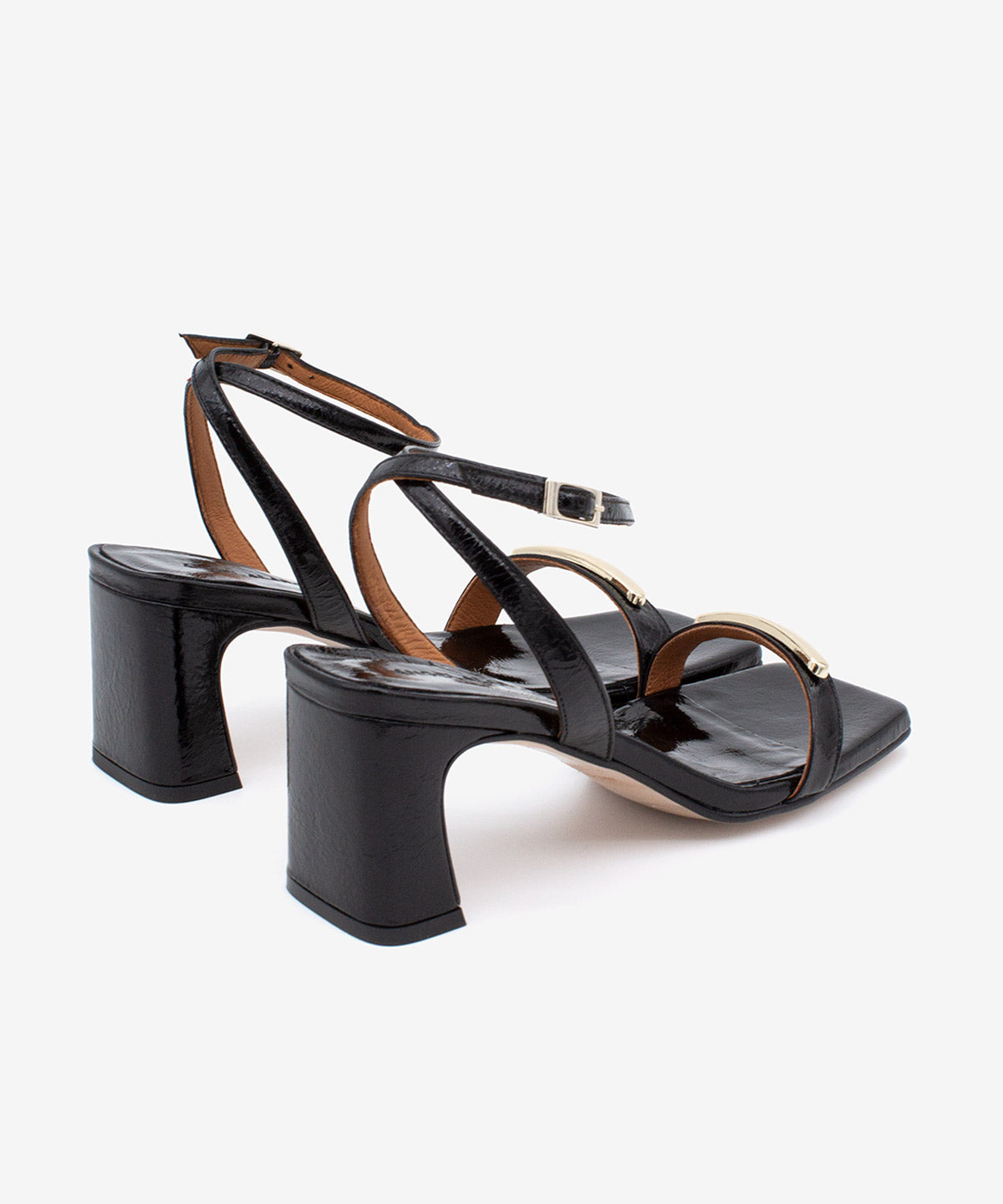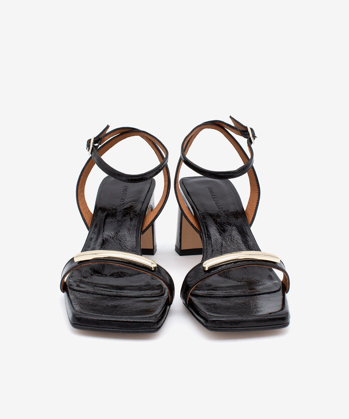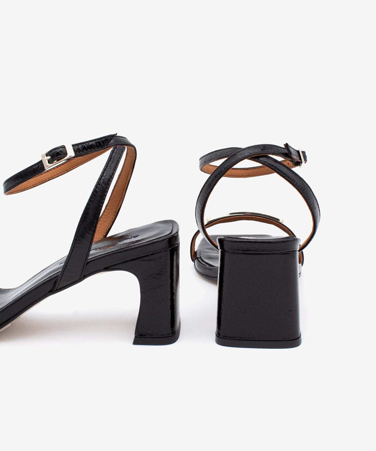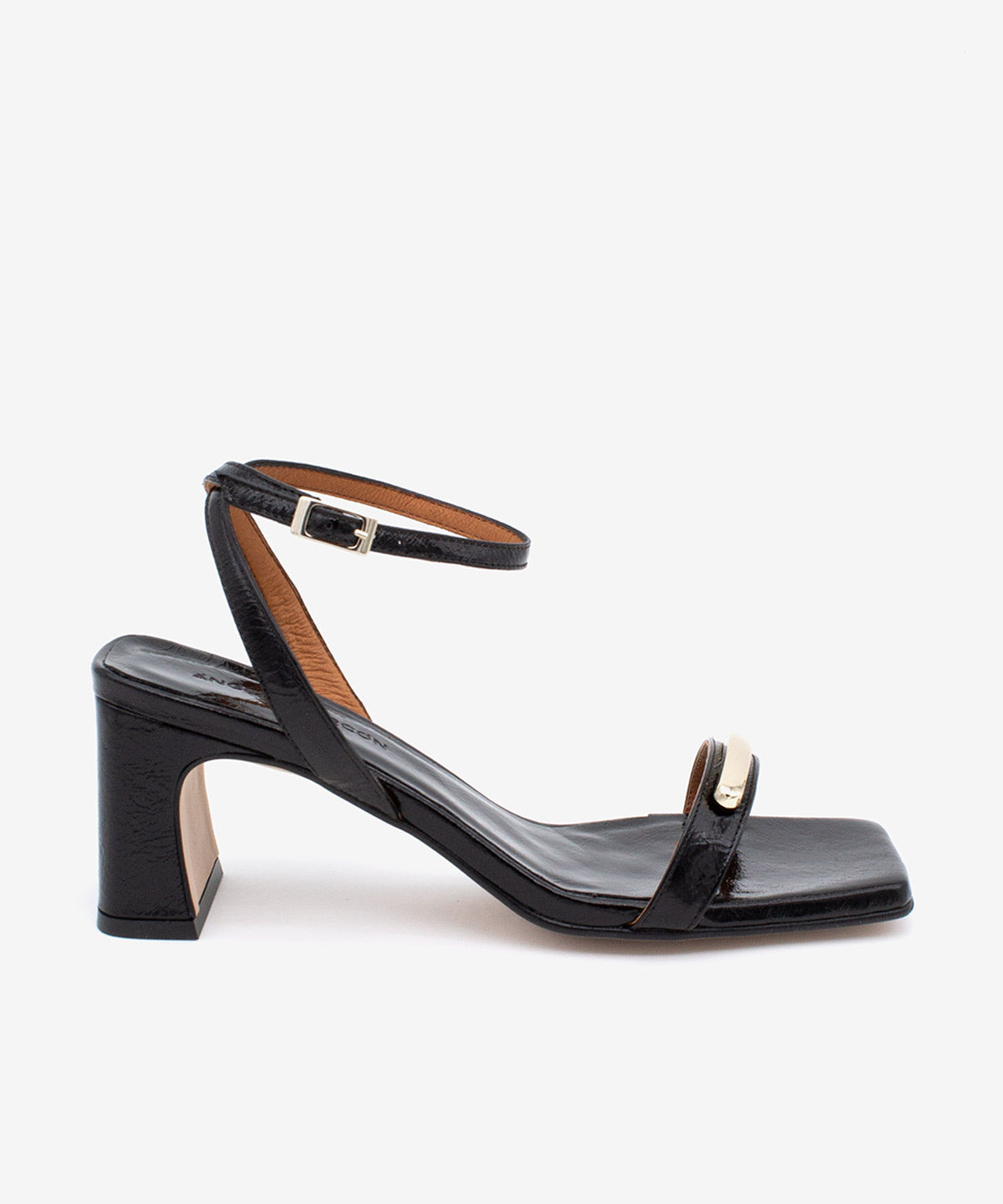 SIBILA is an open women's sandal with a strap featuring a metallic embellishment. It has an open square toe and a 7 cm wide heel. An elegant and sophisticated design that slims the foot, ideal for everyday dressy looks or for special occasions and events. Made from shiny textured leather.