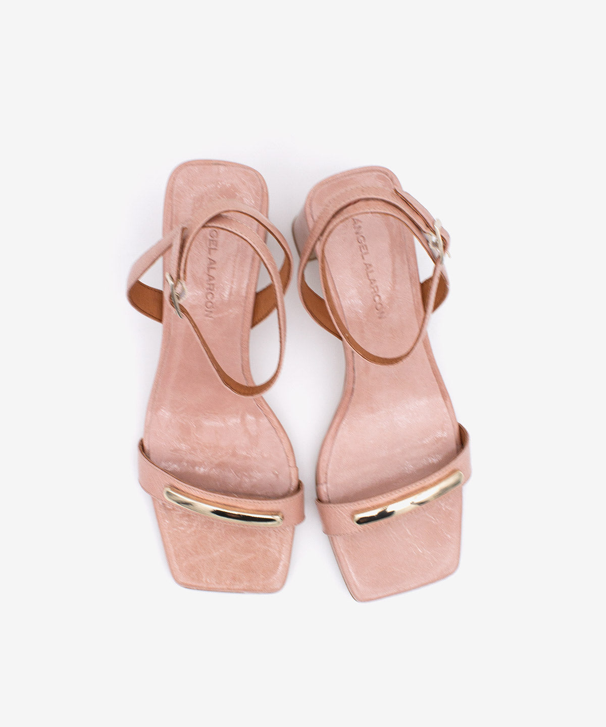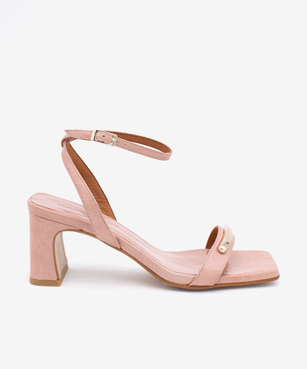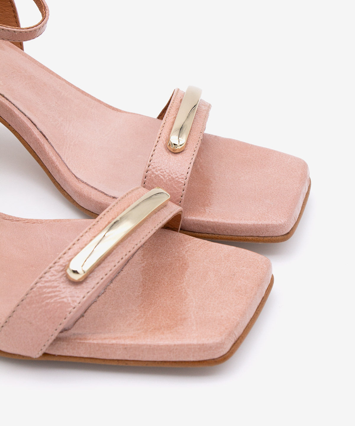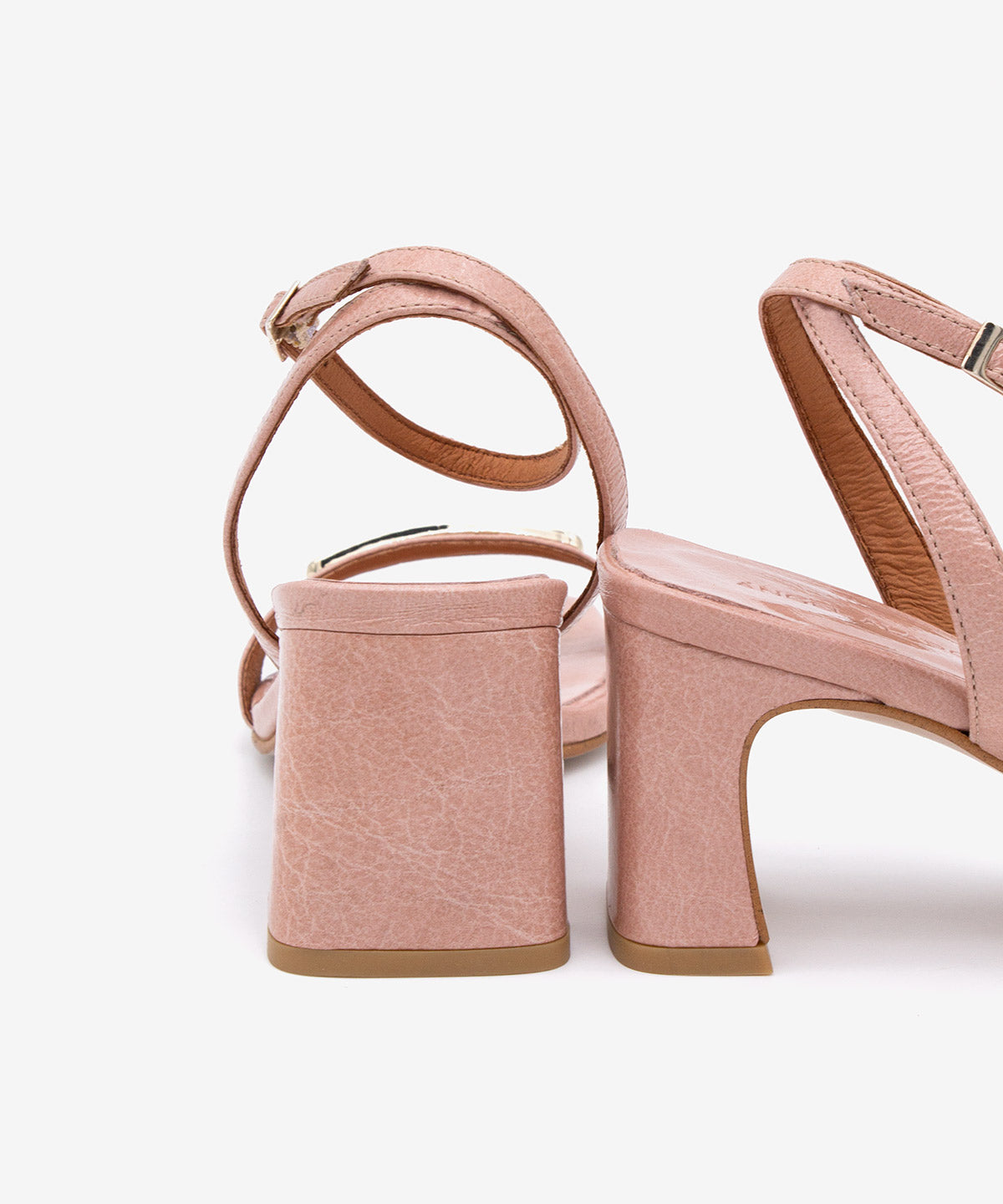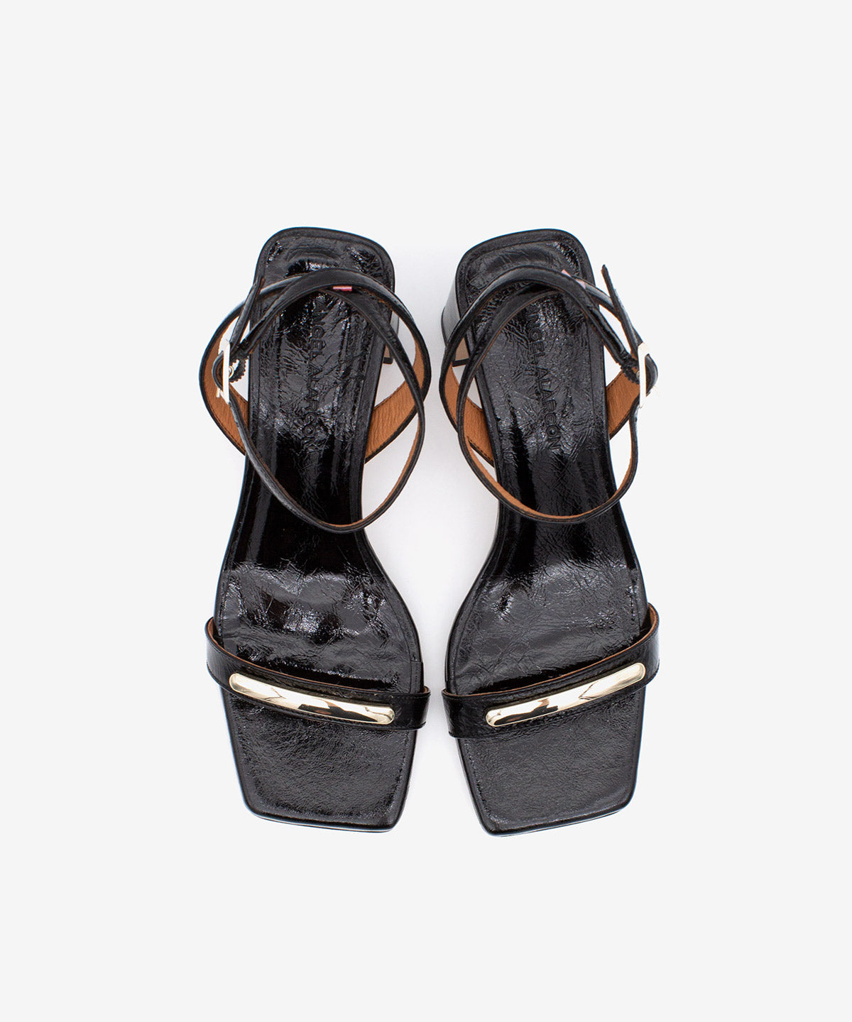 SIBILA is an open women's sandal with a strap featuring a metallic embellishment. It has an open square toe and a 7 cm wide heel. An elegant and sophisticated design that slims the foot, ideal for everyday dressy looks or for special occasions and events. Made from shiny textured leather.