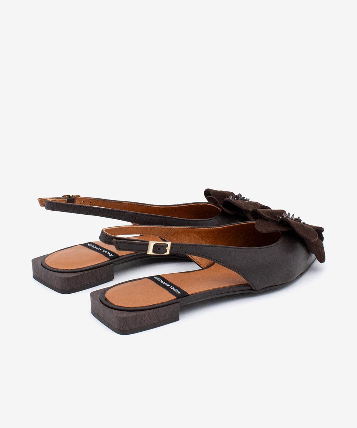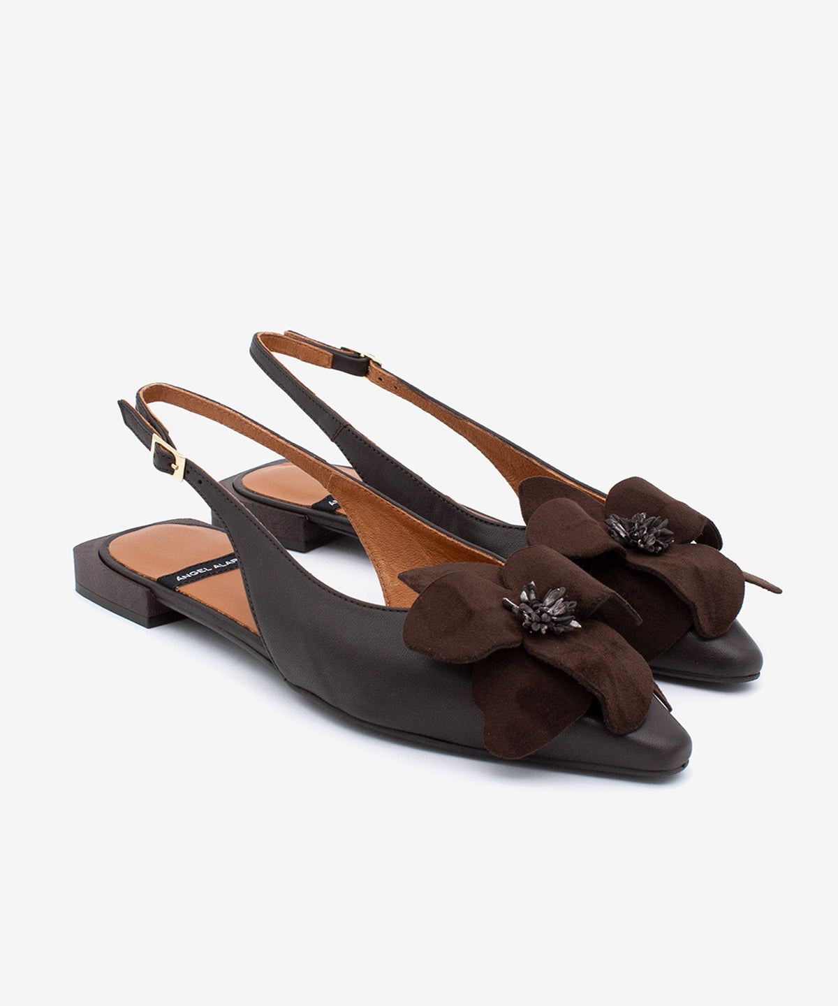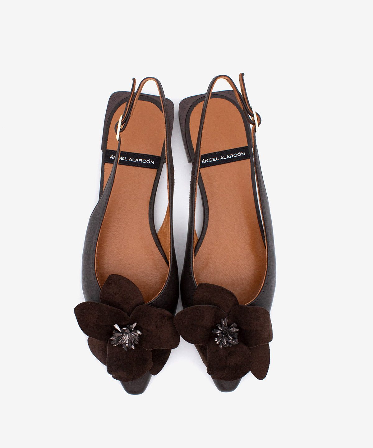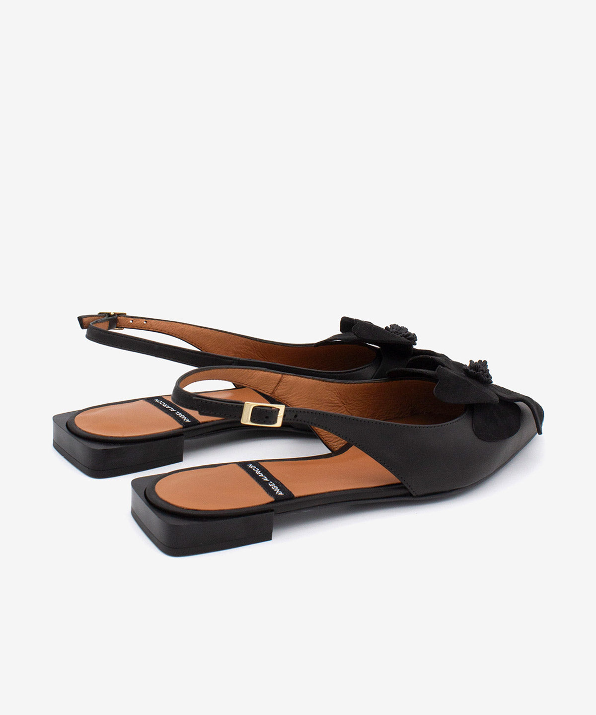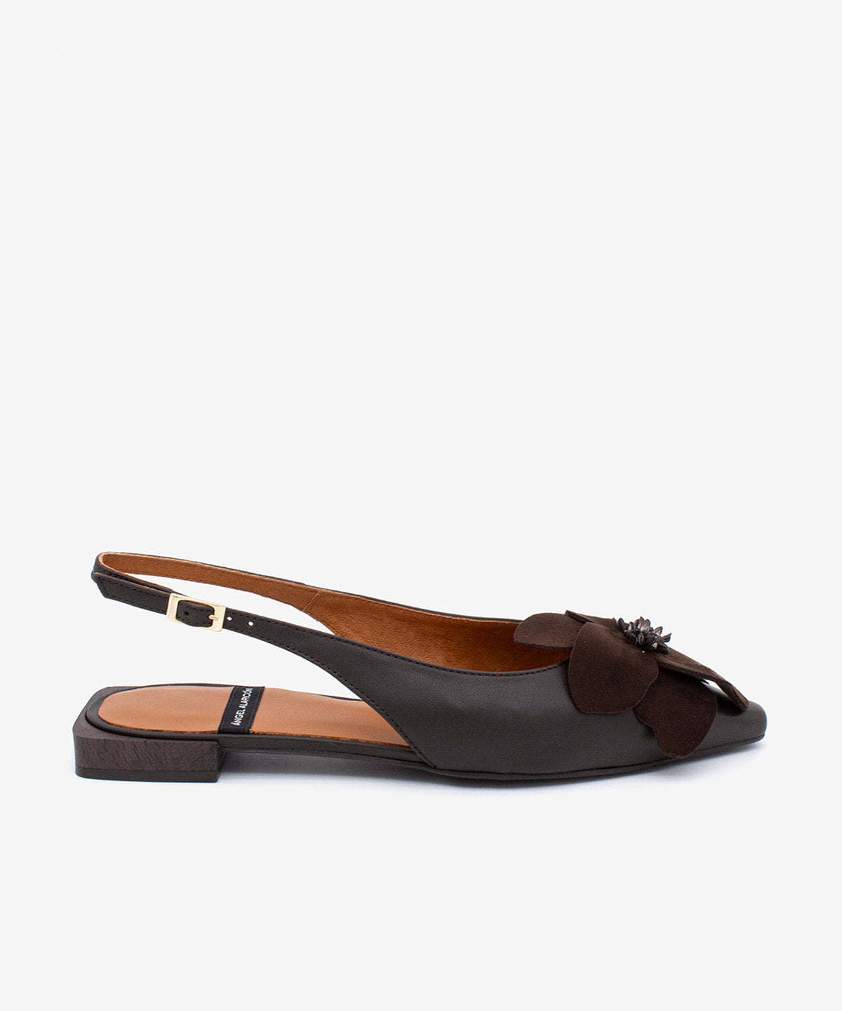 Fiora est une ballerine slingback légère et féminine, avec un bout pointu, un talon plat large de 1,5 cm et un ornement floral qui apporte une touche délicate et spéciale. Conçue pour un usage quotidien, elle est parfaite pour compléter des looks confortables avec une note élégante.